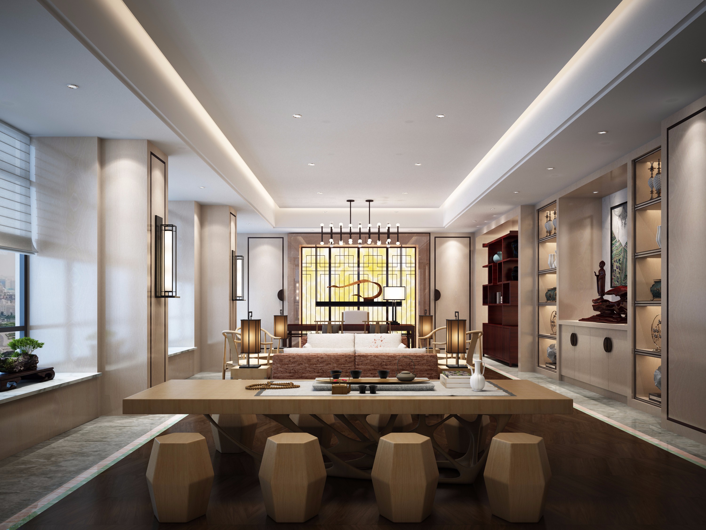 大會議室的設計:本次設計設計師參考了教室的布局模式,這也是設計師不得已而為之,由于空間的面積十分有限,故此設計師只能采用比較保守的設計,以此設計可以順利的進行下去,同時設計師在原有的基礎上,增加了自己對于光學的認識,目的就是希望在保守之際,為空間帶來一絲生機。